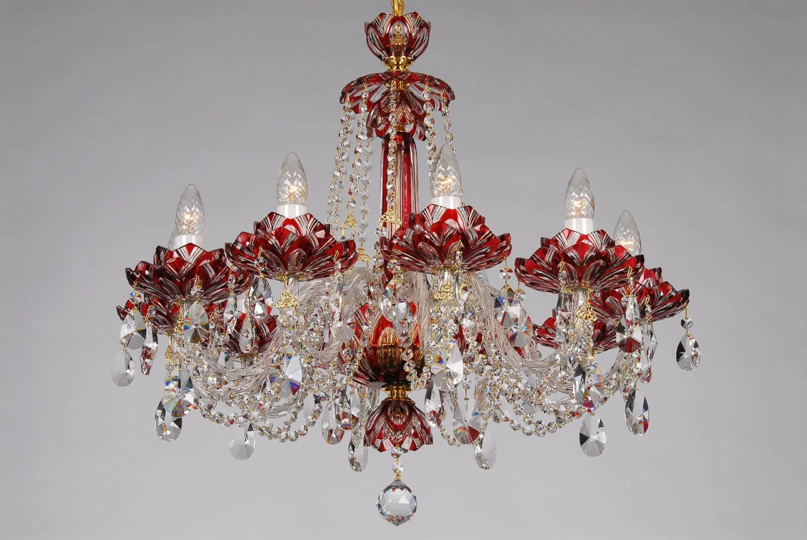 Červený desetiramenný křišťálový lustr v designu lotosových květů. Mísy, misky, poupata (malé misky) a středový díl jsou vyrobeny z ručně broušeného červeného a čirého křišťálu. Ruční práce zaručuje originalitu každého dílu a představuje vrchol sklářského umění. Lustr můžete doplnit červenými nástěnnými svítidly stejného designu, případně kombinovat s většími patnáctiramennými lustry stejné barvy.