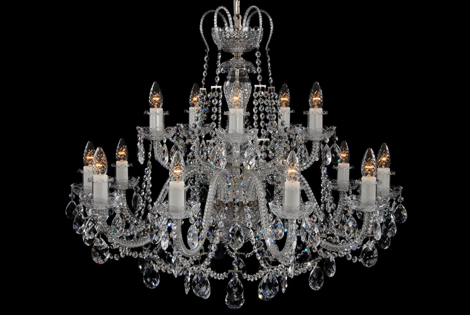 Křišťálový lustr s 15 žárovkami zdobený kovovými díly stříbrné barvy. Spojení čirého křišťálu a stříbrného kování umožňuje variabilní využití lustru bez ohledu na barvu interiéru. Svítidlo je zdobené křišťálovými řetízky a korunkou z malých skleněných ramínek na horní míse. Doporučujeme kombinovat s menšími dvanáctitiramennými lustry zdobenými korunkou, případně doplnit dvouramennými křišťálovými nástěníky stejné barvy.