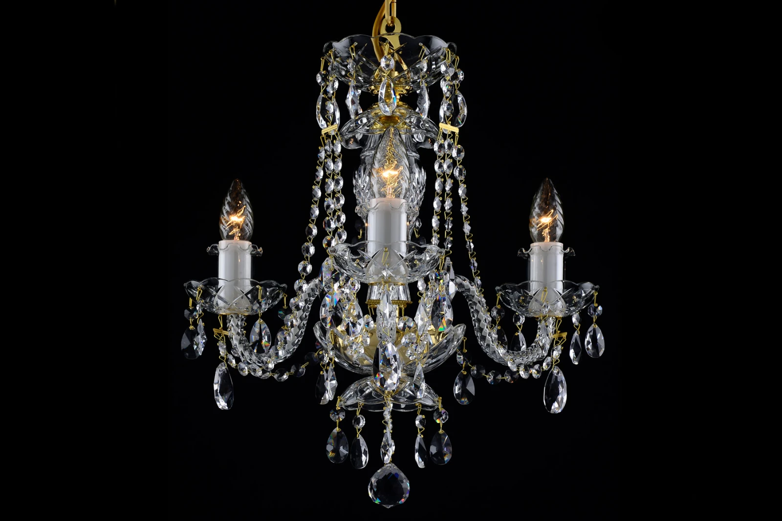 The smallest three-light clear crystal chandelier from LUCKY GLASS product range. Together with larger lamps or chandeliers it can illuminate even a spacious classic interior. This chandelier can be combined with larger six-arm chandeliers of the same design or complemented by one-arm crystal wall lights of the same colour.