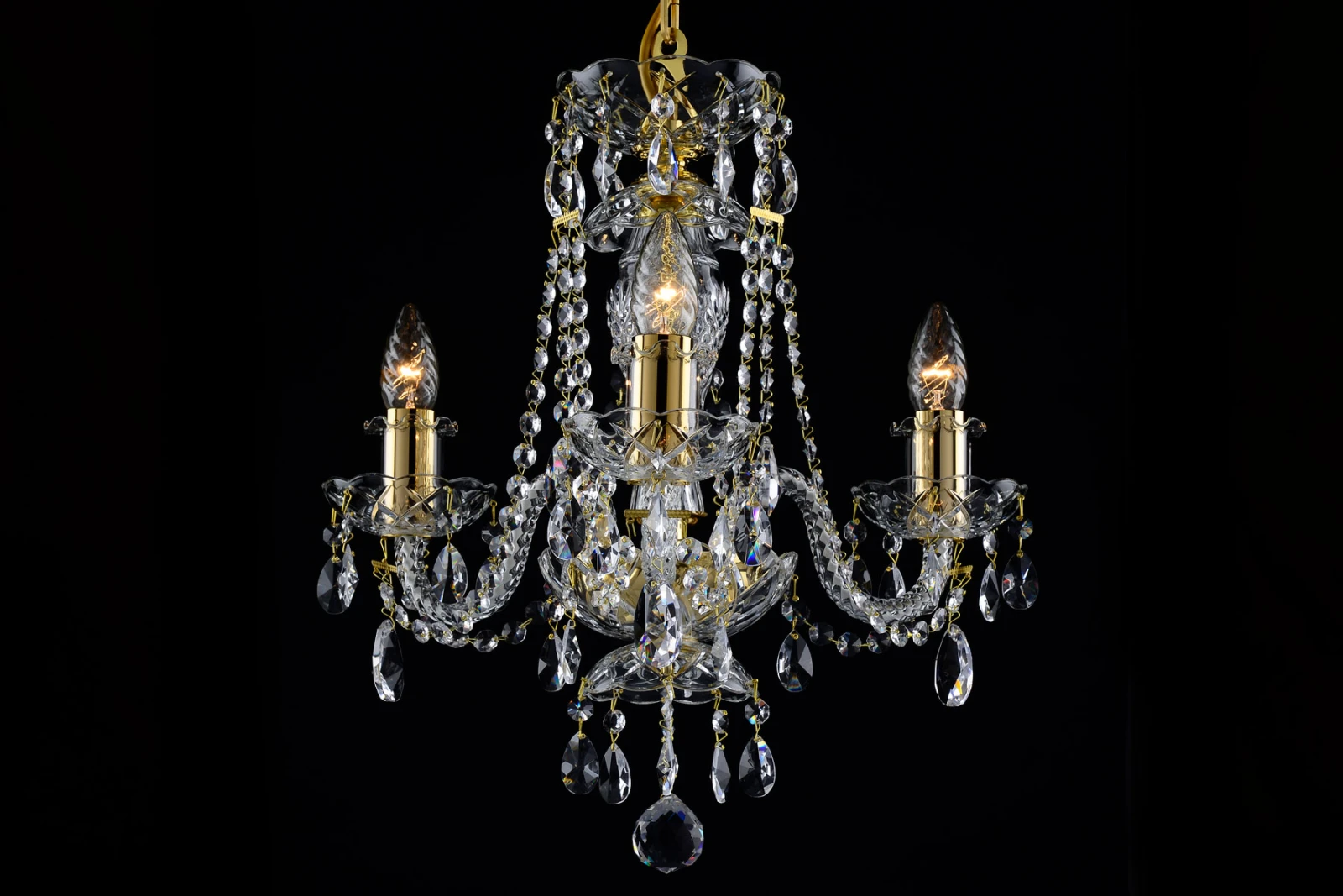 The smallest three-light crystal chandelier from LUCKY GLASS product range. The chandelier is ornamented with leaded crystal chains. The neutral crystal combined with gold coloured fittings is recommended for interiors with golden decorations. This chandelier can be combined with larger six-arm or eight-arm chandeliers of the same design or complemented by one-arm crystal wall lights of the same colour.