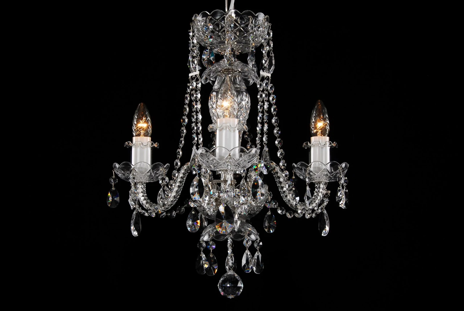 The smallest crystal chandelier with silver coloured metal parts is ornamented with leaded crystal chains. The clear crystal combined with silver fitting can be used in any interior regardless of colour. We recommend combining this chandelier with larger six-arm or eight-arm chandeliers of the same design or complementing them by one-arm crystal wall lights of the same colour.