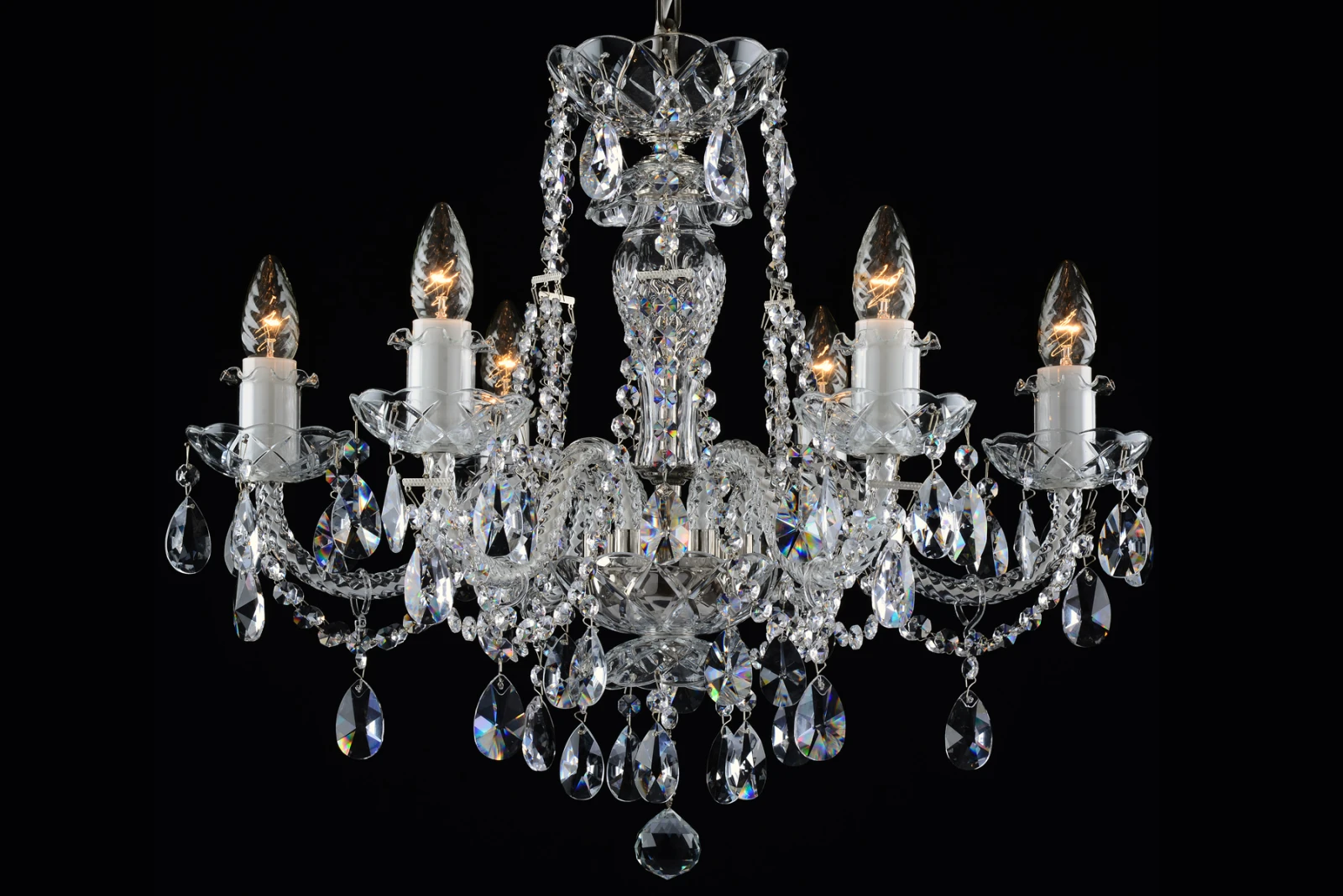 A six-arm crystal chandelier with silver coloured metal parts ornamented with leaded crystal chains. The neutral crystal combined with silver fitting can be used in any interior regardless of colour. We recommend combining this chandelier with larger ten-arm or six-arm chandeliers of similar design or complementing them by one-arm crystal wall lamps of the same colour.