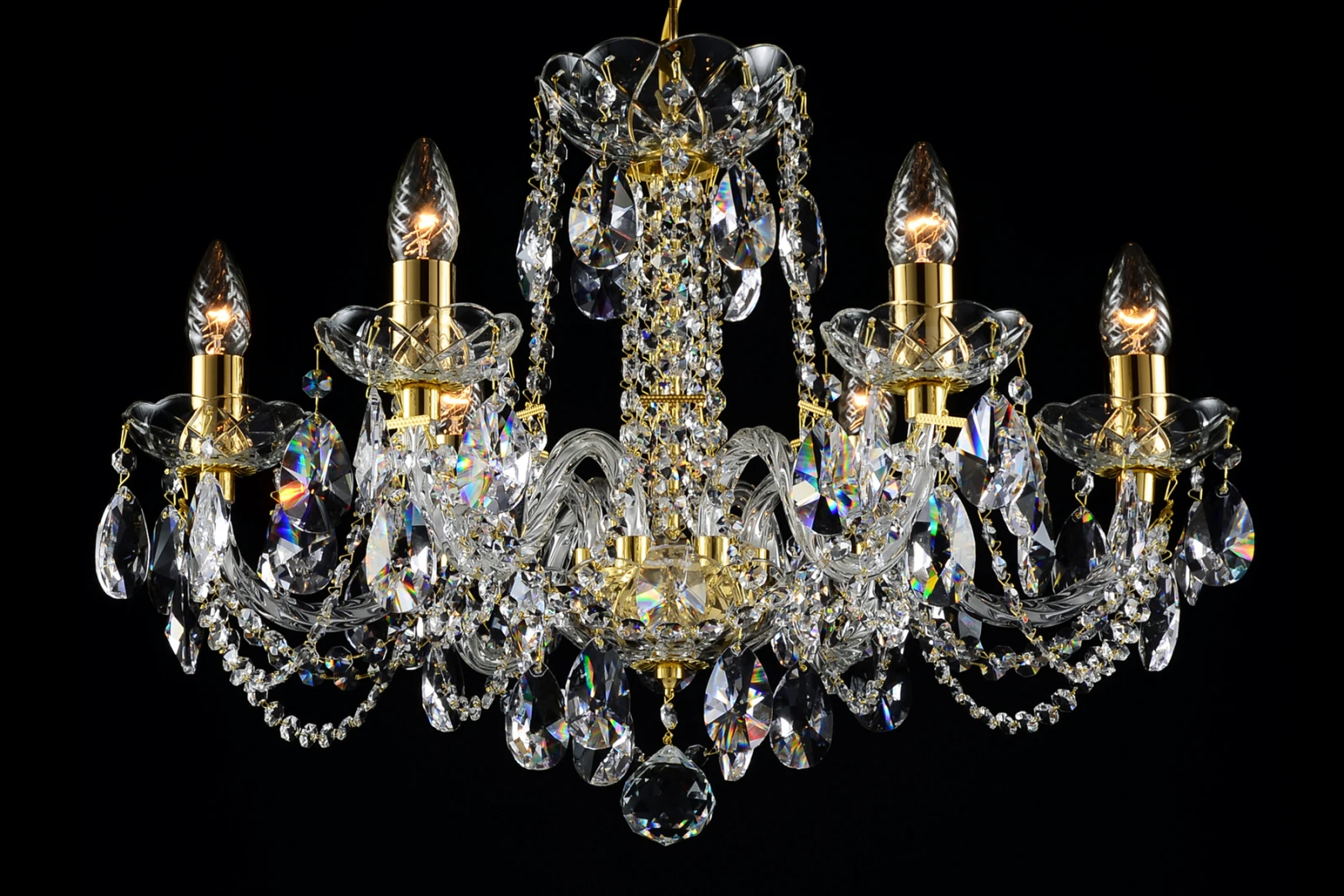 A six-arm gold crystal chandelier that is especially suitable for interiors with low ceilings. Upper and lower part of the chandelier is decorated with crystal chains which also replace the middle part. We use many leaded crystal chains to decorate the lighting, so it shines beautifully. We recommend to combine this chandelier with larger ten-arm or twelve-arm chandeliers of the same design or to complement them by two-arm crystal wall lamps of the same colour.