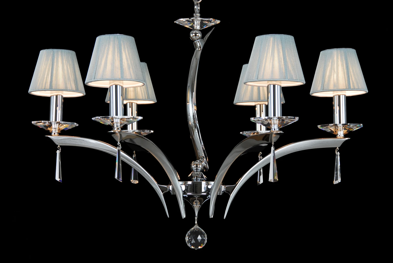 Chrome coated chandelier with fine fabric shades. Limited edition using exclusive silver-grey shades. Especially suitable for modern interiors. The chandelier's body is made of hand-tooled brass which is coated with Chrome. The body is complemented by crystal bobeches and trimmings. The advantage of this chandelier is its fast and easy assembly. The chandelier can be complemented by a two-arm metal wall light of the same design. Furthermore, it can be combined with eight-arm or five-arm chandeliers of the same colour.