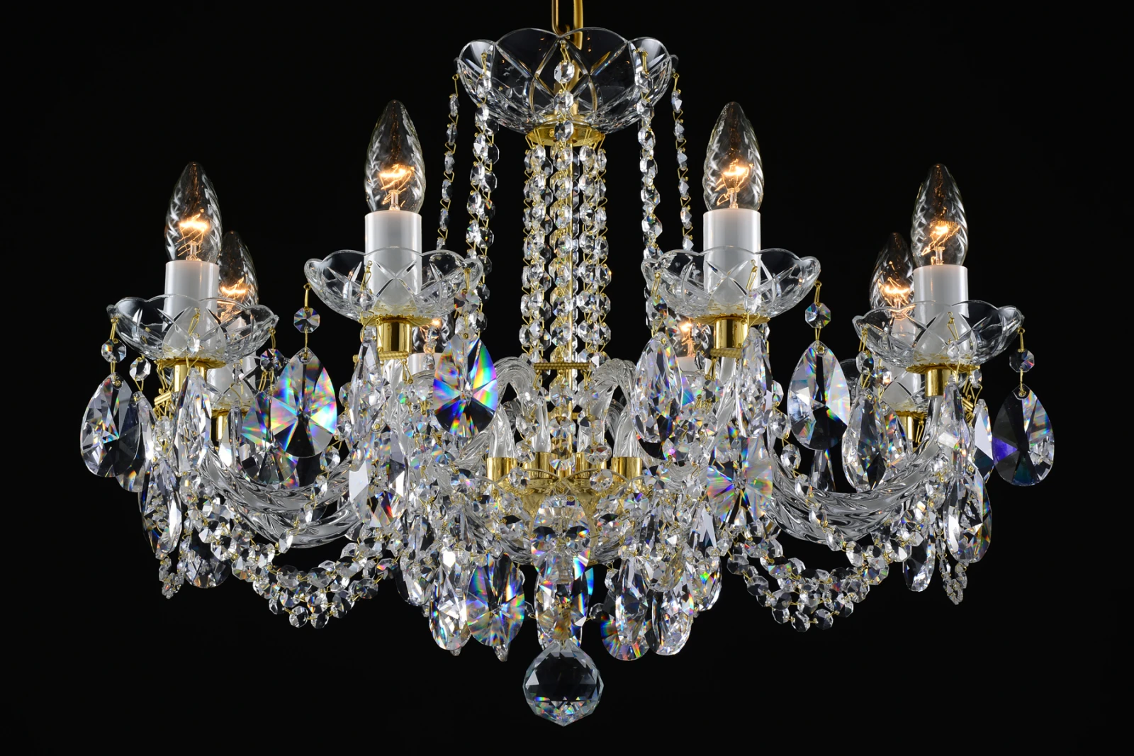 An eight-light colourless crystal chandelier that can decorate spacious interiors with low ceilings. Upper and lower part of the chandelier is decorated with crystal chains which also replace the column. We use many leaded chains so that the chandelier shines beautifully. We recommend combining this chandelier with larger ten-arm or twelve-arm chandeliers of the same design or complementing them by three-arm crystal wall lamps of the same colour.