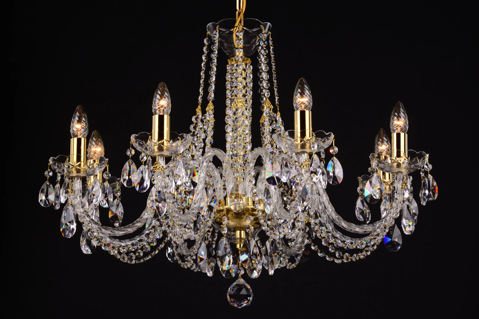 An eight-arm crystal chandelier of middle size which can decorate your spacious interior, even with low ceiling. Upper and lower part of the chandelier is decorated with crystal chains which also replace the column. Crystal small and big cups are hand cut. We use many leaded chains so that the chandelier can shine beautifully. The neutral crystal combined with gold coloured fittings is recommended for interiors with golden decorations.