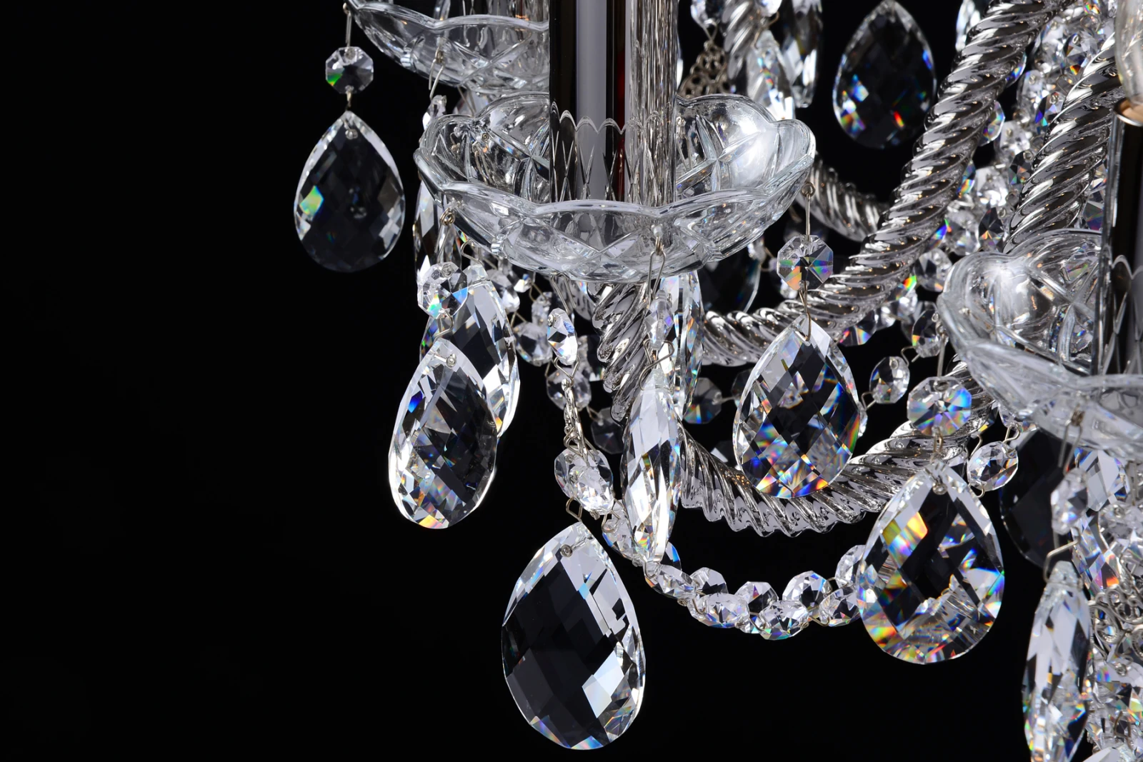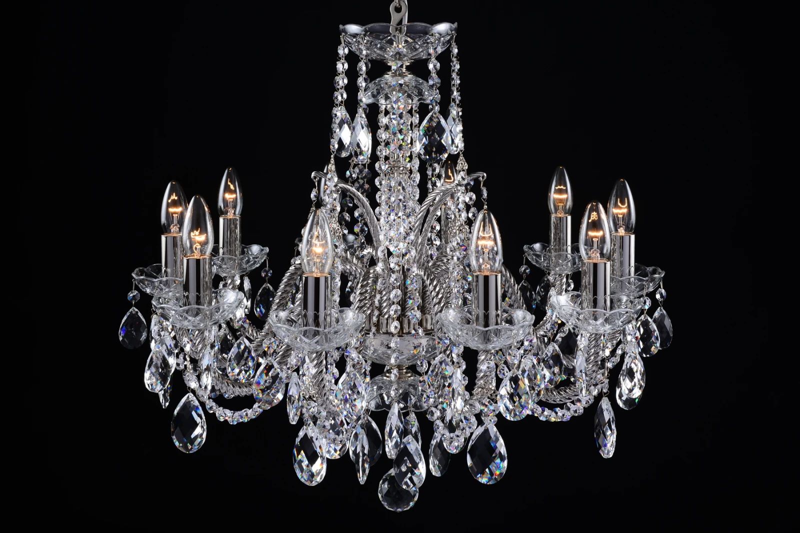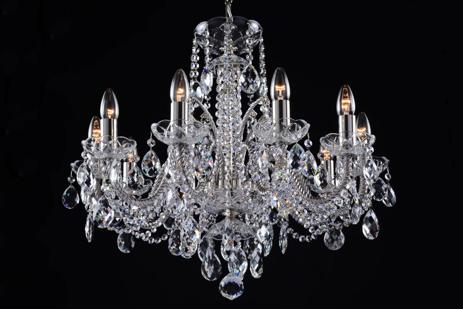 A ten-arm coated crystal chandelier from our Coated Crystal product range. The arms, stems and candle tubes are made of technical glass coated with silver coloured noble metal. This chandelier is especially suitable for modern interiors with trendy decorative elements. The coated parts have similar effect to a mirror and therefore can emphasize the colour of your interior. This chandelier can be combined with two-arm wall lamps of the same design or complemented by larger fifteen-arm chandeliers of the same colour.