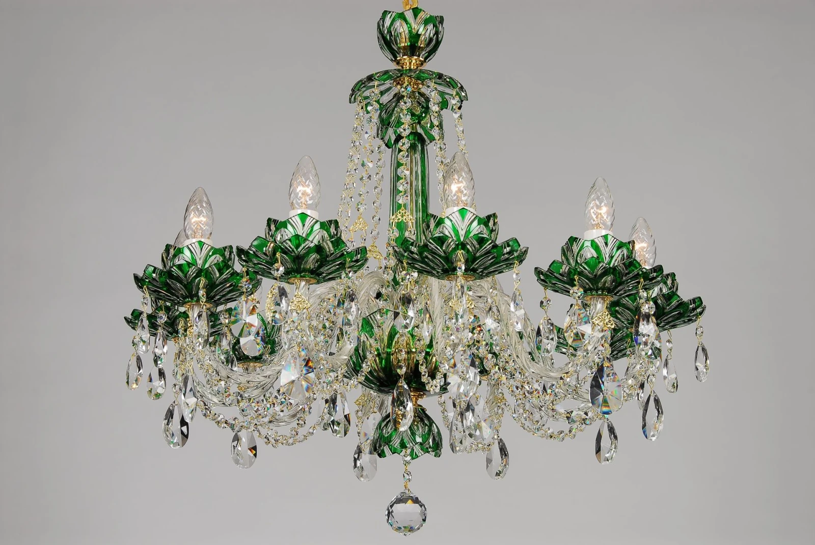 A ten-arm green crystal chandelier with lotus flower design. The chandelier's dishes, buds (bobeches) and column are made of hand cut green and clear crystal. Hand crafting guarantees originality of each component and therefore these chandeliers rank among the finest products of glass art. The chandelier can be combined with larger fifteen-arm chandeliers of the same colour. On your request, we can make you green wall lights of the same design.