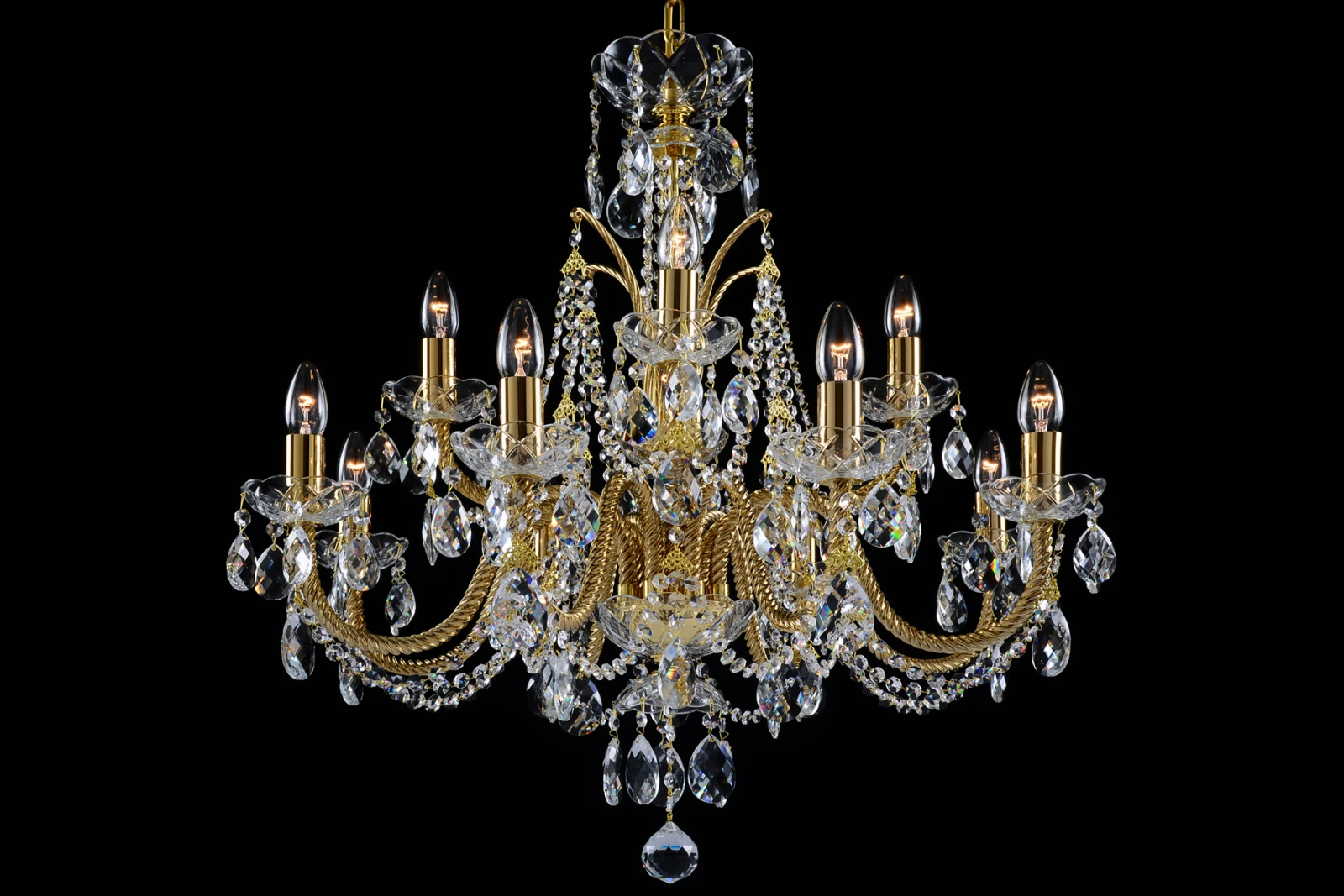This gold chandelier suits the best for your timeless classic interior. The 12-arm lighting perfectly shine up your home. Brilliant shine thanks to combination of gold and clear crystal is the crucial benefit of coated crystal chandelier from our Coated Crystal range. The arms, stems and tubes are coated with gold coloured noble metal, dishes and bobeches are made of pressed glass. Gold lighting can be combined with two-arm wall lamps of the same design or complemented by smaller ten-arm chandeliers of the same colour.