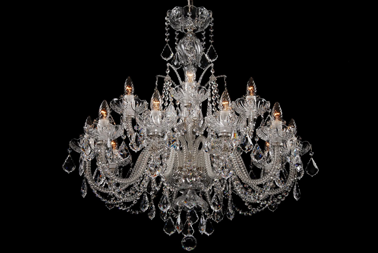A fifteen-arm clear crystal chandelier coated with silver coloured metal. The chandelier's dishes, bobeches and column are made of hand cut colourless crystal. Hand crafting guarantees originality of each component and therefore these chandeliers rank among the finest products of glass art. If you wish so, you can combine this chandelier with clear wall lights that have the same design and that are also coated with silver coloured metal. The chandelier can be also complemented by smaller six-arm or ten-arm chandeliers of the same colour.
