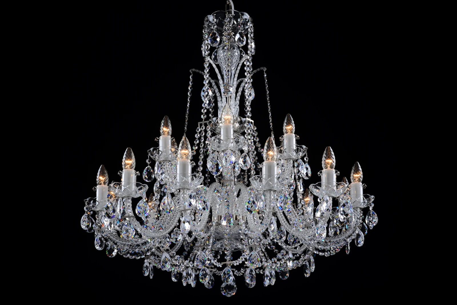 An eighteen-arm crystal chandelier decorated with silver coloured metal parts. The neutral crystal combined with silver coloured metal does not require you to change the colour of your interior. The chandelier is decorated with crystal chains and a crown in the middle part of the chandelier. We recommend combining the chandelier with larger 24-arm or smaller fifteen-arm chandeliers of the same design. The eighteen-arm chandelier can illuminate and complement even a spacious hotel corridor. This chandelier can be combined with crystal wall lamps of the same colour.