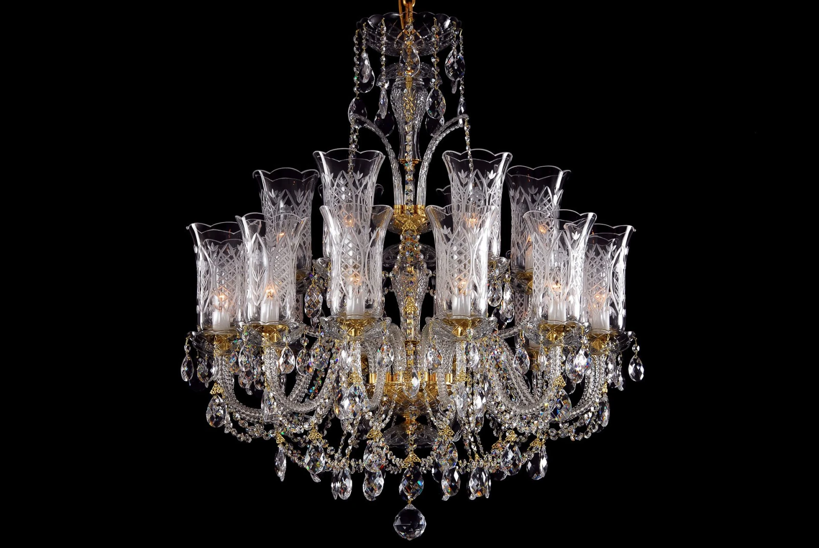 An eighteen-arm crystal chandelier decorated with hand cut vases. A deluxe crystal chandelier with golden metal parts. Hand cut vases guarantee originality of each chandelier and rank among the finest products of glass art. This chandelier can be combined with smaller twelve-arm or eight-arm chandeliers of the same type.