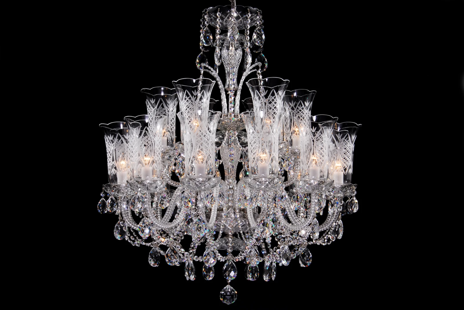 An eighteen-arm crystal chandelier decorated with hand cut vases. A deluxe crystal chandelier with silver metal parts. Hand cut vases guarantee originality of each chandelier and rank among the finest products of glass art. This chandelier can be combined with smaller twelve-arm or eight-arm chandeliers of the same type.