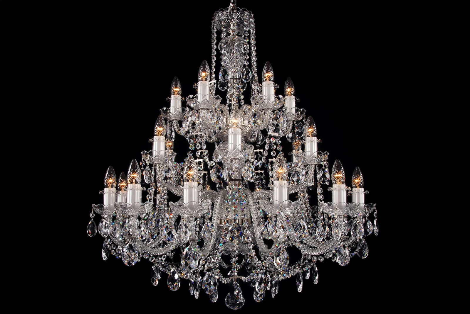 A 24-arm colourless crystal chandelier decorated with silver coloured metal. This chandelier can illuminate spacious interiors, stylish bars, communal rooms, ballrooms and other large spaces. The universal combination of clear crystal with silver coloured metal does not require you to change the colour of your interior. We recommend combining the chandelier with larger eighteen-arm or fifteen-arm chandeliers of the same design. In order to hang the chandelier successfully, the ceiling has to be 3.5 metres high and the load capacity of the ceiling needs to be at least 52 kg. This chandelier can be combined with crystal wall lamps of the same colour.