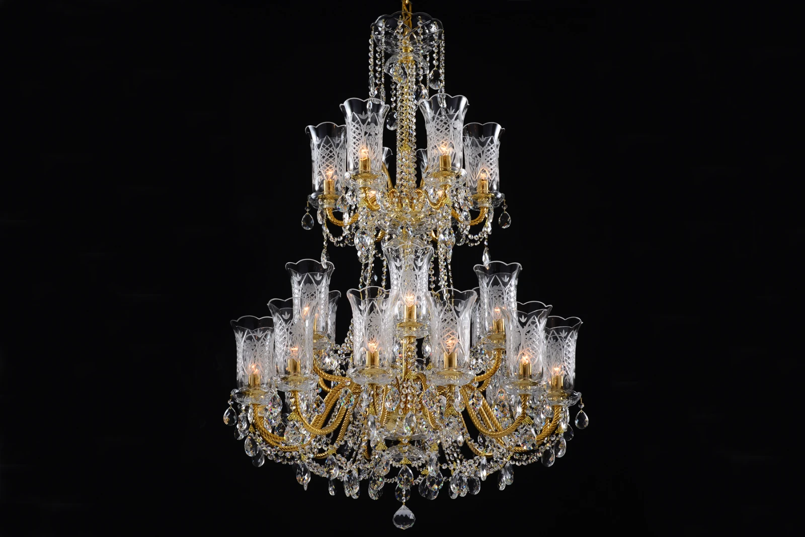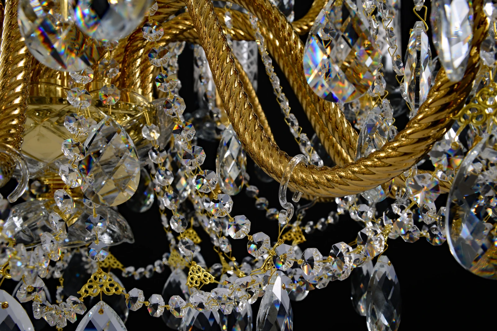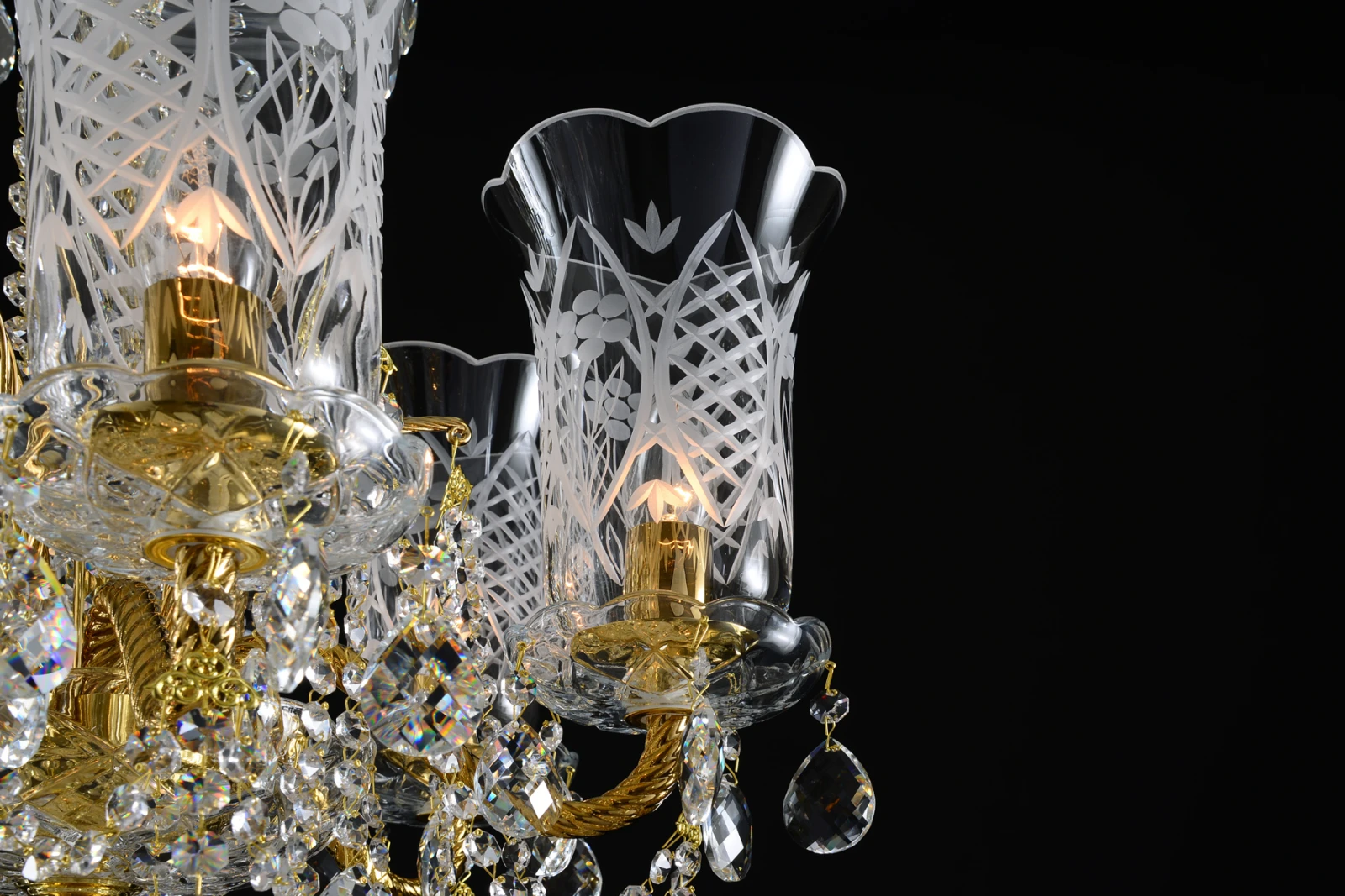 The biggest crystal chandelier decorated with hand cut vases and gold coated arms. A deluxe crystal chandelier with shiny golden metal parts. Hand cut vases guarantee originality of each chandelier and rank among the finest products of glass art. This chandelier can be combined with smaller twelve-arm or eight-arm chandeliers of the same type.