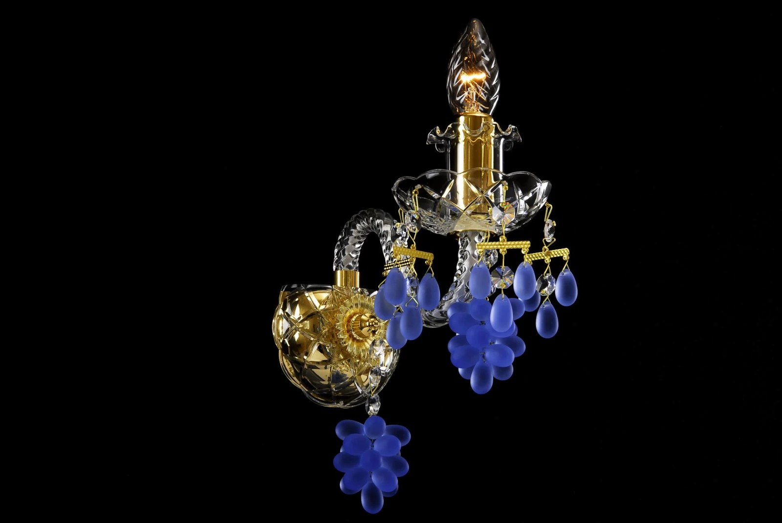 The smallest one-light crystal wall lamp ornamented with grape-shaped trimmings and complemented by golden metal parts. The trimmings are available in white, blue, green, violet, pink and yellow. The neutral crystal combined with grape drops and gold coloured fittings is recommended for interiors with golden decorations. The wall lamp can be combined with six-arm or five-arm chandeliers that have the same design and colour of grape trimmings. It can be also complemented by larger two-arm crystal wall lights of the same colour.