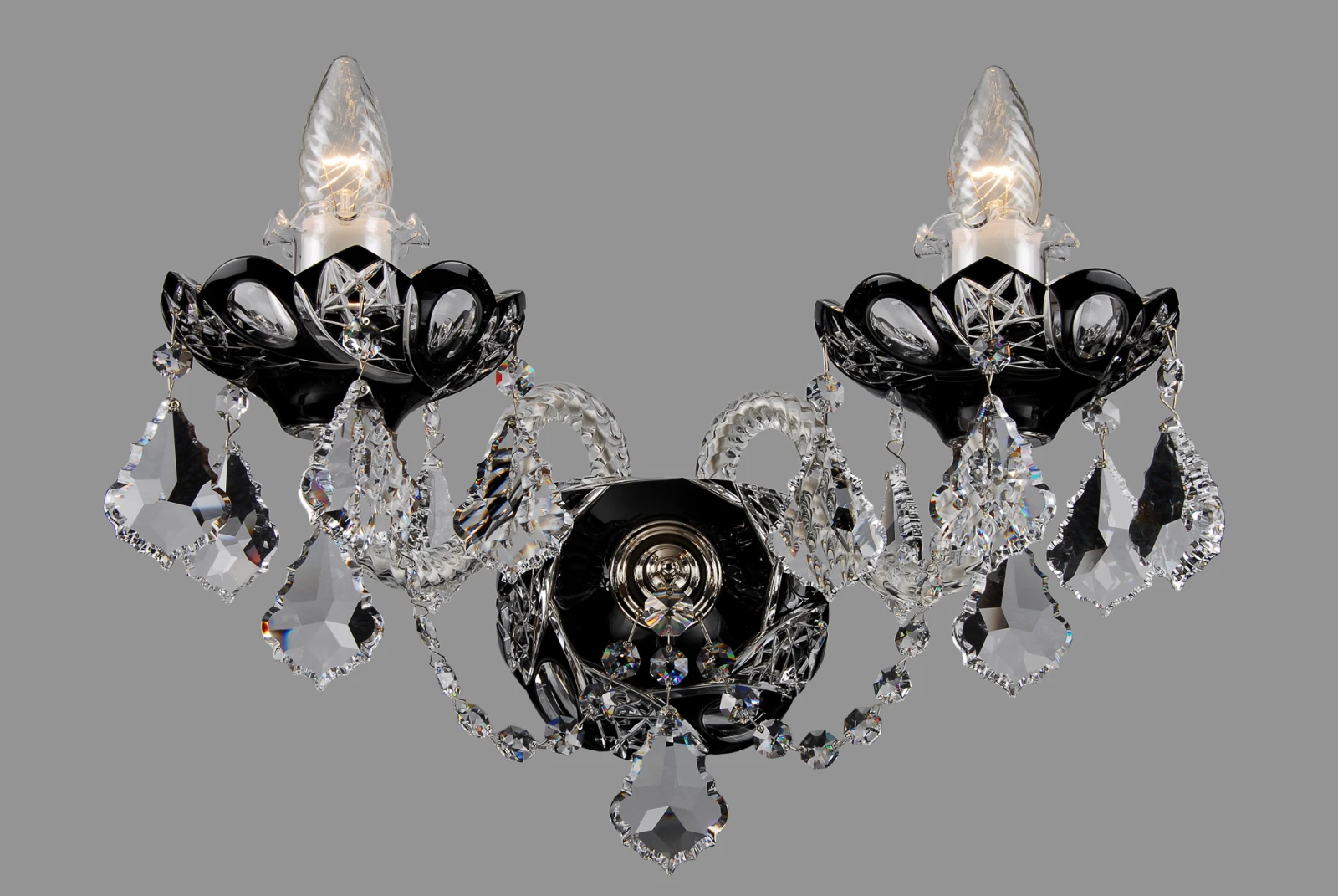 Black crystal wall light with silver coloured metal. The dishes and bobeches are made of hand cut clear and black leaded crystal. Hand crafting guarantees originality of each component and therefore these wall lamps rank among the finest products of glass art. The wall lamp with silver coloured metal parts can be complemented by six-arm, ten-arm or fifteen-arm chandeliers of the same design.