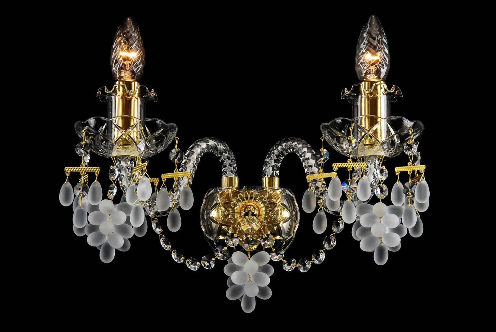A twp-arm crystal wall light decorated with grape-shaped trimmings and complemented by golden metal parts. The trimmings are available in white, blue, green, violet, pink and yellow. The clear crystal combined with grape drops and gold coloured fittings is recommended for interiors with golden decorations. The wall lamp can be combined with six-arm or five-arm chandeliers that have the same design and same colour of grape trimmings. It can be also complemented by one-arm crystal wall lights of the same colour.