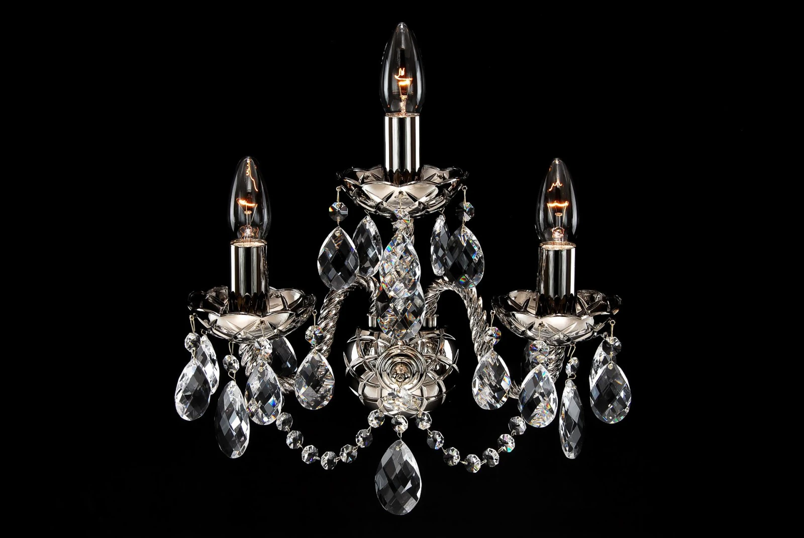 A three-arm crystal wall lamp from the Coated Crystal product range. The dishes and bobeches are made of pressed glass coated with silver coloured noble metal. The coated parts have similar effect to a mirror and therefore can emphasize the colour of your interior. The wall lamp can be combined with one-arm and two-arm wall lights of the same colour or complemented by coated chandeliers of the same design.