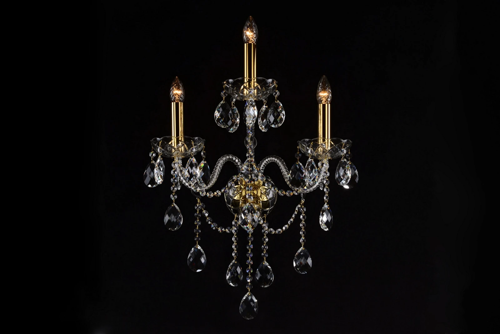 A three-arm neutral crystal wall light from the basic Crystal product range. The wall lamp can be combined with other colourless chandeliers or complemented by smaller two-arm or one-arm crystal wall lights of the same colour in order to illuminate the whole room.