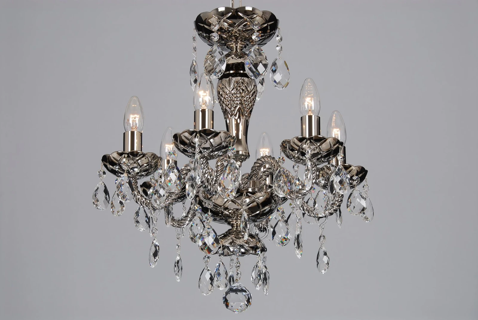 Наименьший представитель металлизированных хрустальных люстр из серии Coated Crystal. Чашки, чаши и центральная часть изготовлены из прессованного стекла, покрытого благородным металлом серебристого цвета. Эта шестирожковая люстра особенно уместна в интерьерах с ограничением пространственных условий и высоты потолка. Зеркальный эффект металлизированных деталей подчеркнет цветовую гамму вашего интерьера. Люстру можно дополнить бра того же дизайна или комбинировать с более крупными люстрами того же цвета.