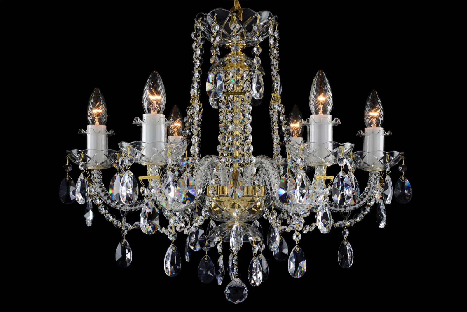 Люстра из бесцветного хрусталя с 6 лампами, украшенная цепочками из свинцового хрусталя. Верхняя часть люстры украшена хрустальными цепочками, которыми заменена и центральная часть. Использование большого количества цепочек из свинцового хрусталя гарантирует высокий блеск светильника. Рекомендуется комбинировать ее с более крупными десятирожковыми или двенадцатирожковыми люстрами подобного дизайна либо дополнить однорожковыми хрустальными бра того же цвета.