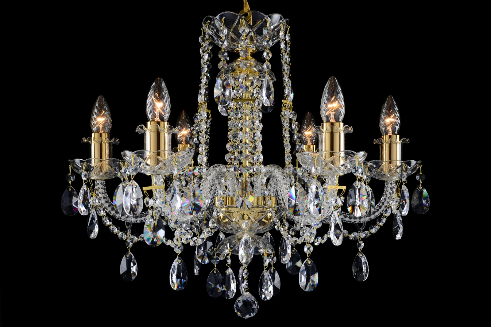 Хрустальная люстра с 6 лампами, украшенная металлическими деталями золотистого цвета. Верхняя часть люстры декорирована хрустальными цепочками, которыми заменена и центральная часть. Использование большого количества цепочек из свинцового хрусталя гарантирует высокий блеск светильника. Сочетание бесцветного хрусталя и золотистых металлических деталей люстры рекомендуется для интерьеров с золотистыми декоративными элементами. Люстру можно комбинировать с более крупными десятирожковыми или двенадцатирожковыми люстрами подобного дизайна либо дополнить однорожковыми хрустальными бра того же цвета.