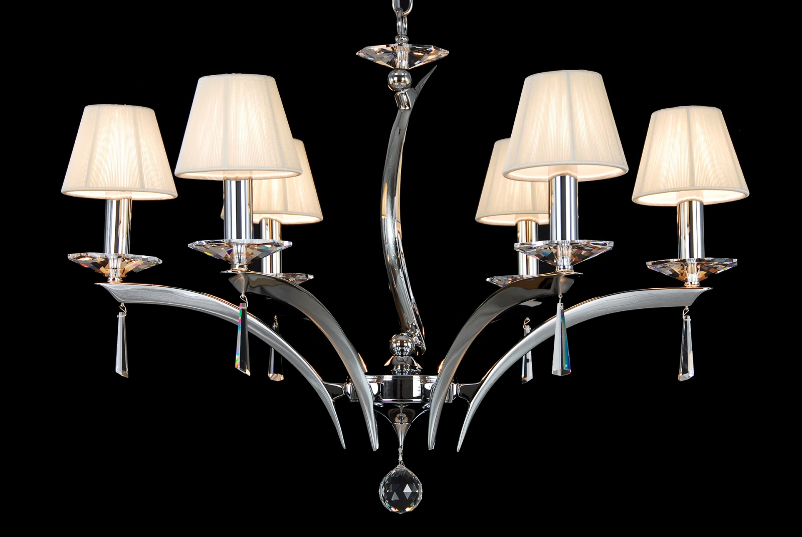 Серебристая металлическая люстра с плафонами для современных интерьеров. Корпус люстры изготовлен из хромированной латуни ручной обработки и дополнен хрустальными чашками и подвесками. Светильник отлично комбинируется с элементами из нержавеющей стали и серебристыми деталями в интерьере. Преимущество металлического светильника – быстрый и легкий монтаж. Люстру можно дополнить двухрожковым металлическим бра того же дизайна либо более крупными двенадцатирожковыми или меньшими пятирожковыми люстрами того же цвета.