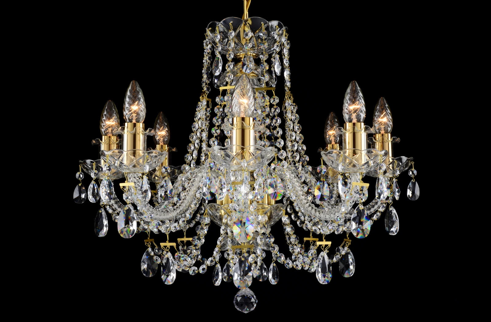 Восьмирожковая хрустальная люстра с металлическими деталями золотистого цвета, украшенная цепочками из свинцового хрусталя. Сочетание бесцветного хрусталя и золотистых металлических деталей люстры рекомендуется прежде всего для интерьеров с золотистыми декоративными элементами. Люстру можно комбинировать с более крупными двенадцатирожковыми или меньшими шестирожковыми люстрами того же дизайна либо дополнить двухрожковыми хрустальными бра того же цвета.