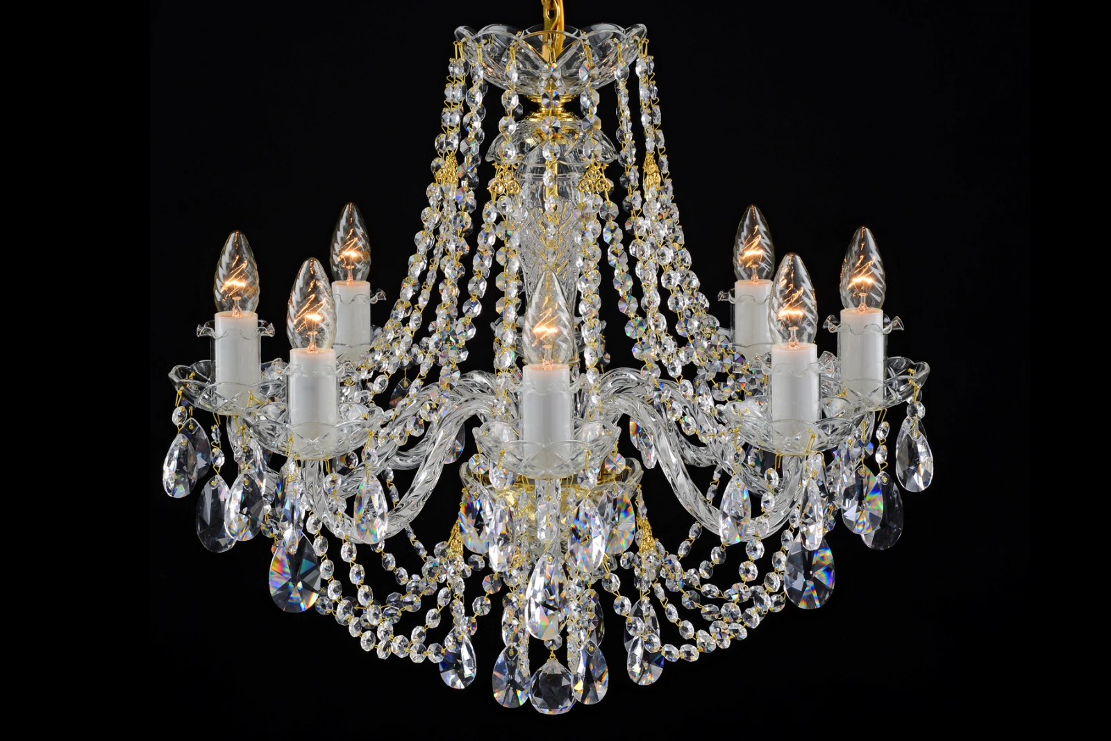 Восьмирожковая люстра из бесцветного хрусталя, богато украшенная цепочками из свинцового хрусталя. Убор из подвесок, напоминающий по форме корзину, гарантирует высокий блеск люстры, этот светильник озарит ваш интерьер. Ее можно комбинировать с более крупными десятирожковыми люстрами подобного дизайна или дополнить однорожковыми хрустальными бра того же цвета.