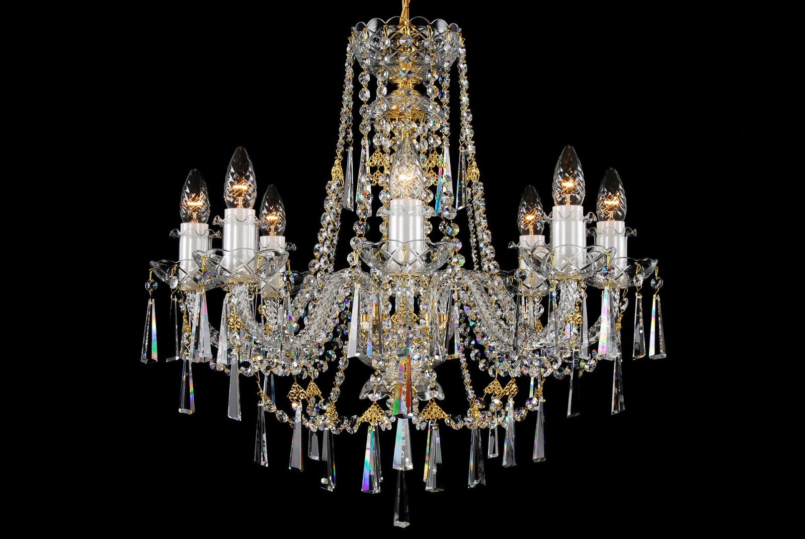Восьмирожковая люстра из бесцветного хрусталя, украшенная длинными подвесками в форме копыта. Светильник декорирован множеством хрустальных цепочек, гарантирующих высокий блеск. Люстру можно комбинировать с другими восьмирожковыми люстрами подобного дизайна. По желанию люстру можно дополнить хрустальными бра с подвесками того же типа.
