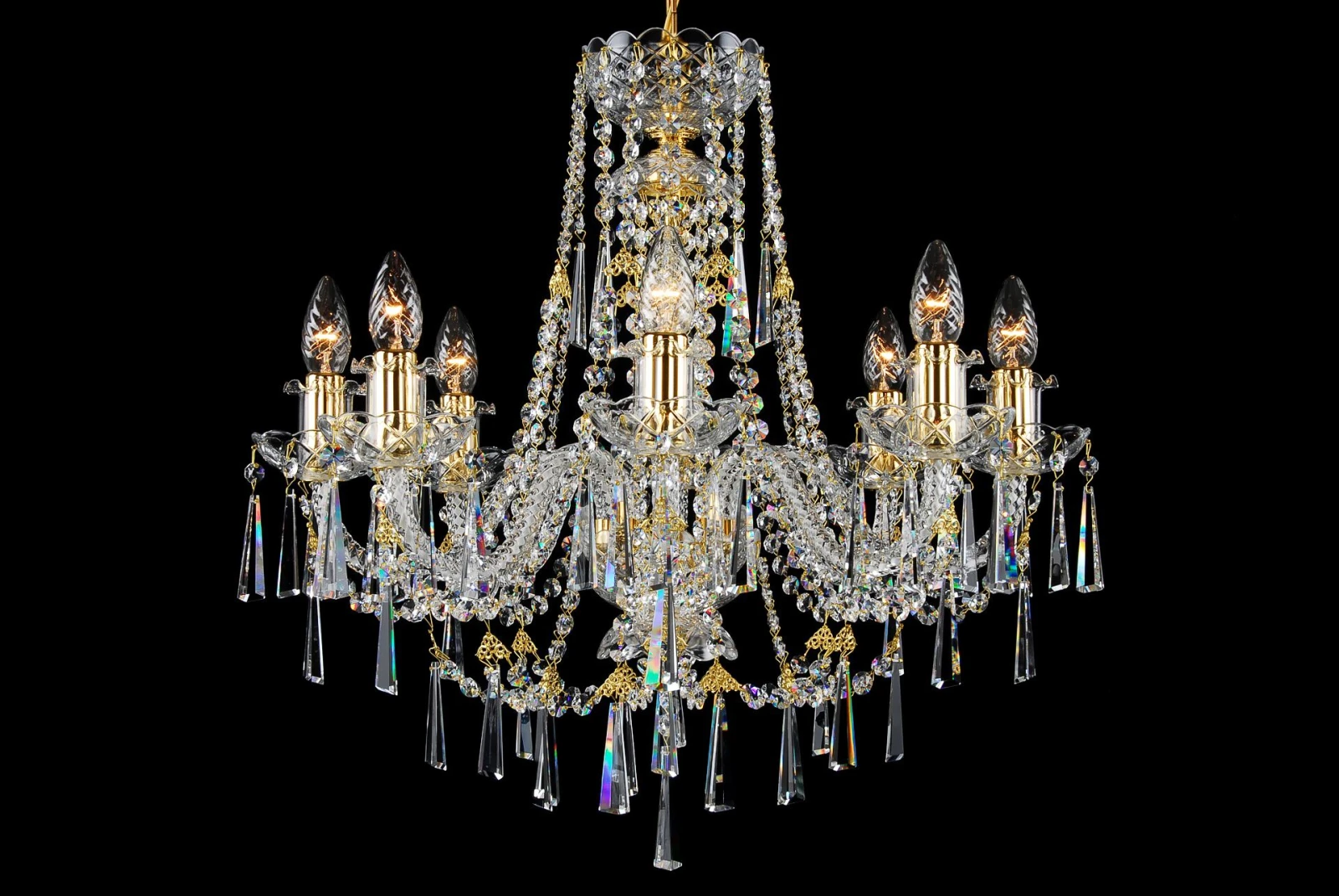 Восьмирожковая хрустальная люстра с металлом золотистого цвета, украшенная длинными подвесками в форме копыта. Светильник декорирован множеством хрустальных цепочек, гарантирующих высокий блеск. Сочетание бесцветного хрусталя и золотистых металлических деталей люстры рекомендуется прежде всего для интерьеров с золотистыми декоративными элементами. Люстру можно комбинировать с восьмирожковыми люстрами подобного дизайна. По желанию люстру можно дополнить хрустальными бра с подвесками того же типа.