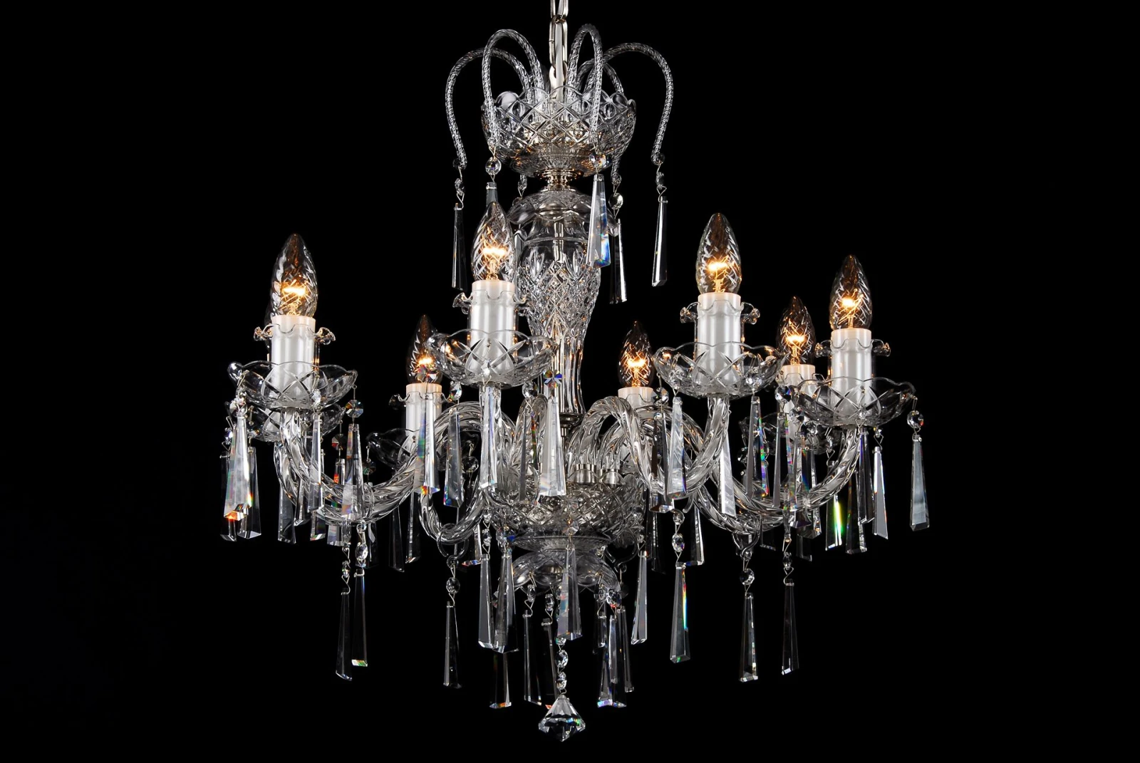Восьмирожковая хрустальная люстра, декорированная длинными подвесками, концы которых имеют форму копыта. Светильник без хрустальных цепочек украшен коронкой из небольших стеклянных усиков на верхней чаше. Сочетание бесцветного хрусталя и серебристой фурнитуры обеспечивает вариабельность использования люстры независимо от цвета интерьера. Рекомендуется комбинация с восьмирожковыми люстрами подобного дизайна. По желанию люстру можно дополнить хрустальными бра с подвесками того же типа.