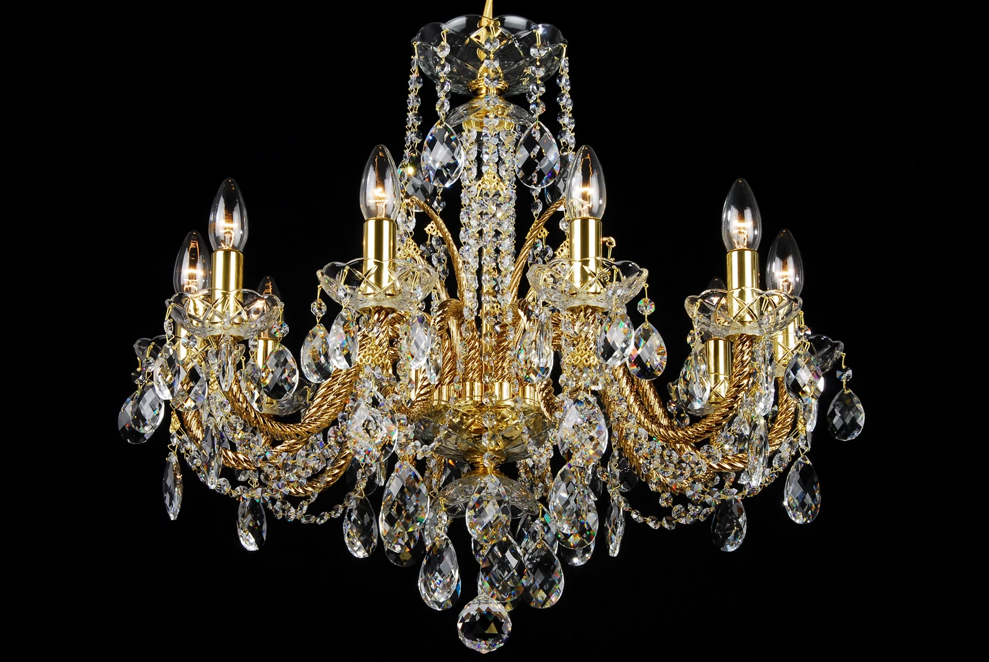 Десятирожковая металлизированная хрустальная люстра из серии Coated Crystal. Стеклянные рожка изготовлены из технического стекла покрытого благородным металлом золотистого цвета. Чашки и чаши изготовлены из прессованного стекла. Люстра особенно уместна в современных интерьерах с золотыми декоративными элементами. Люстру можно дополнить двухрожковыми бра того же дизайна или комбинировать с более крупными пятнадцатирожковыми люстрами того же цвета.