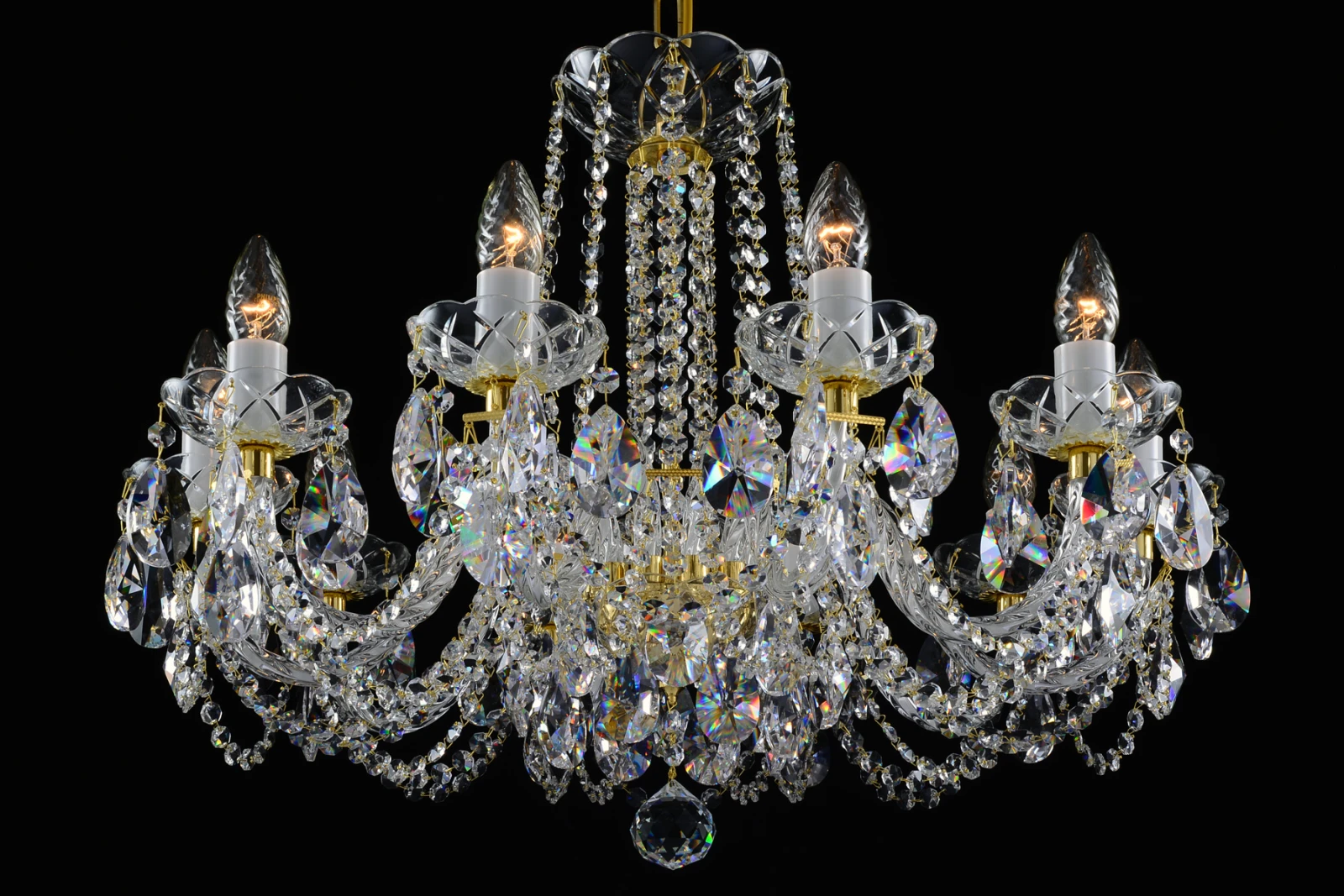 Люстра из бесцветного хрусталя с 10 лампами, которая украсит интерьер с низкими потолками. Верхняя и нижняя части люстры украшены хрустальными цепочками, которыми заменена и центральная часть. Использование множества цепочек из свинцового хрусталя гарантирует высокий блеск светильника. Люстру можно комбинировать с меньшими восьмирожковыми или более крупными двенадцатирожковыми люстрами того же дизайна либо дополнить двухрожковыми хрустальными бра того же цвета.