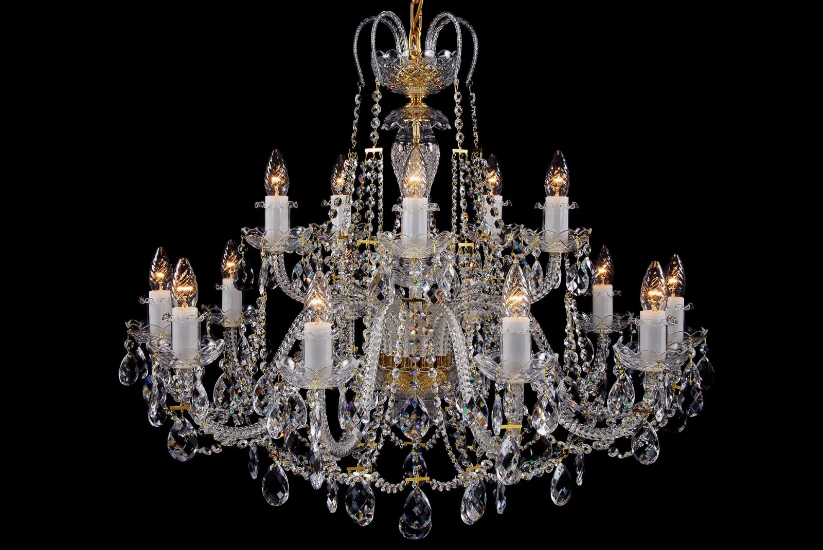 Пятнадцатирожковая люстра из бесцветного хрусталя из серии светильников Crystal. Светильник украшен хрустальными цепочками и коронкой из небольших стеклянных усиков на верхней чаше. Рекомендуется комбинировать ее с меньшими двенадцатирожковыми люстрами, украшенными коронкой, или дополнить двухрожковыми хрустальными бра того же цвета.