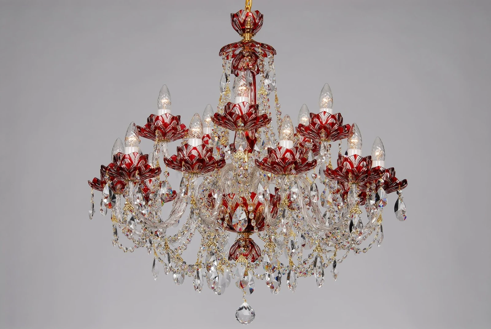Пятнадцатирожковая люстра из красного хрусталя с дизайном цветов лотоса. Чаши, чашки, бутоны (малые чашки) и центральная часть изготовлены из красного и бесцветного хрусталя ручной обработки. Ручная работа гарантирует оригинальность каждого компонента и представляет собой вершину стекольного искусства. Цвет металлических деталей хорошо сочетается с золотистыми декоративными элементами интерьера. Люстру можно дополнить красными бра того же дизайна или комбинировать с меньшими десятирожковыми люстрами того же цвета.