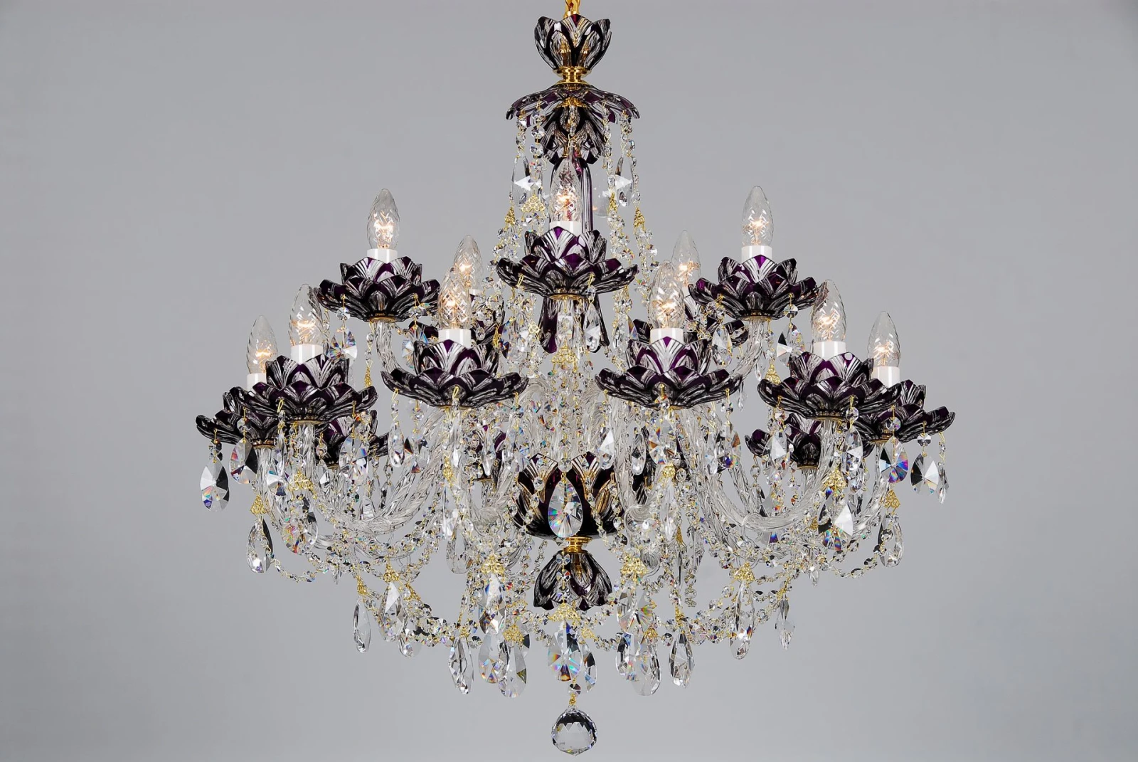 Пятнадцатирожковая люстра из фиолетового хрусталя с дизайном цветов лотоса. Чаши, чашки, бутоны (малые чашки) и центральная часть изготовлены из темно-фиолетового и бесцветного хрусталя ручной обработки. Ручная работа гарантирует оригинальность каждого компонента и представляет собой вершину стекольного искусства. Цвет металлических деталей хорошо сочетается с золотистыми декоративными элементами интерьера. Люстру можно дополнить фиолетовыми бра того же дизайна или комбинировать с меньшими десятирожковыми люстрами того же цвета.